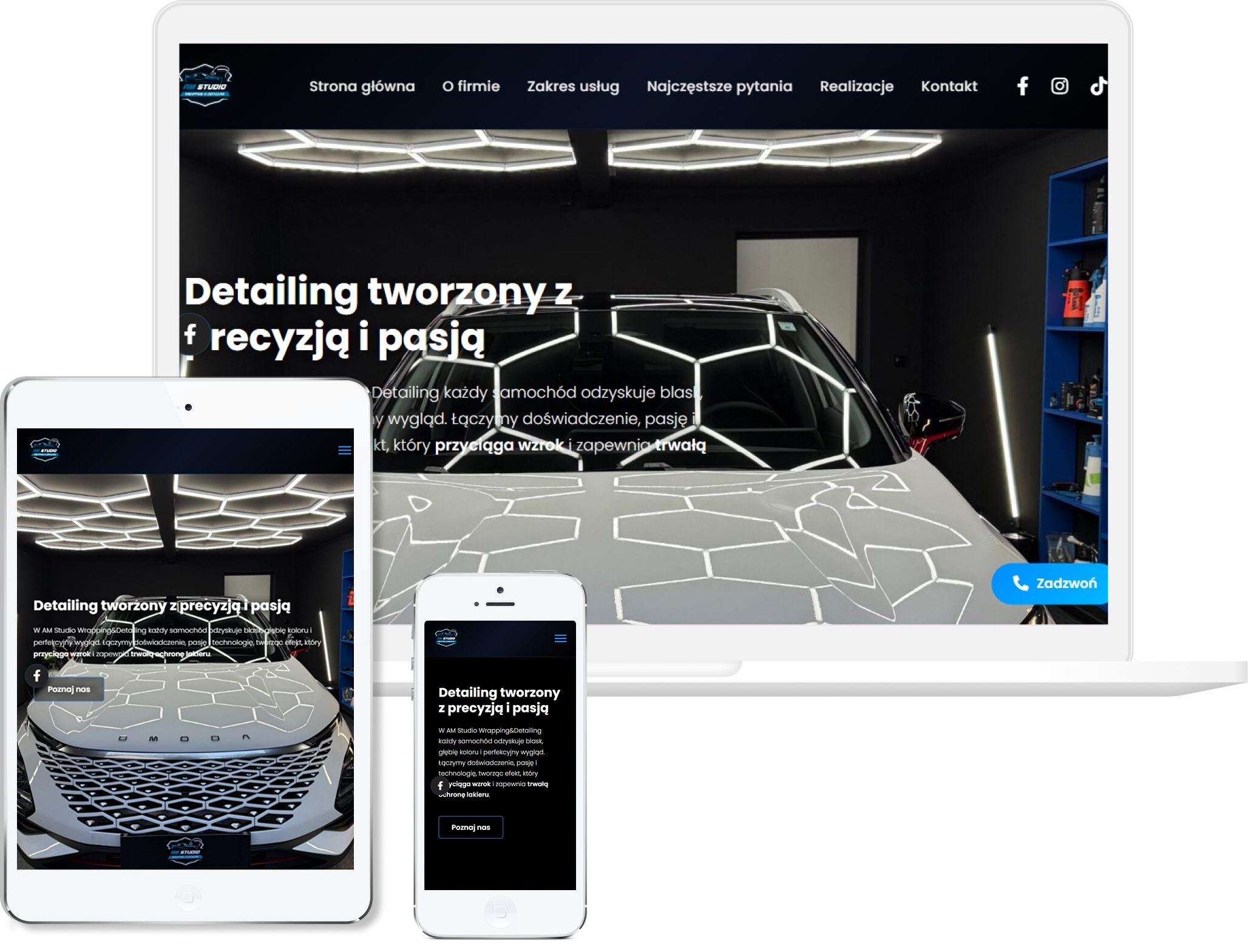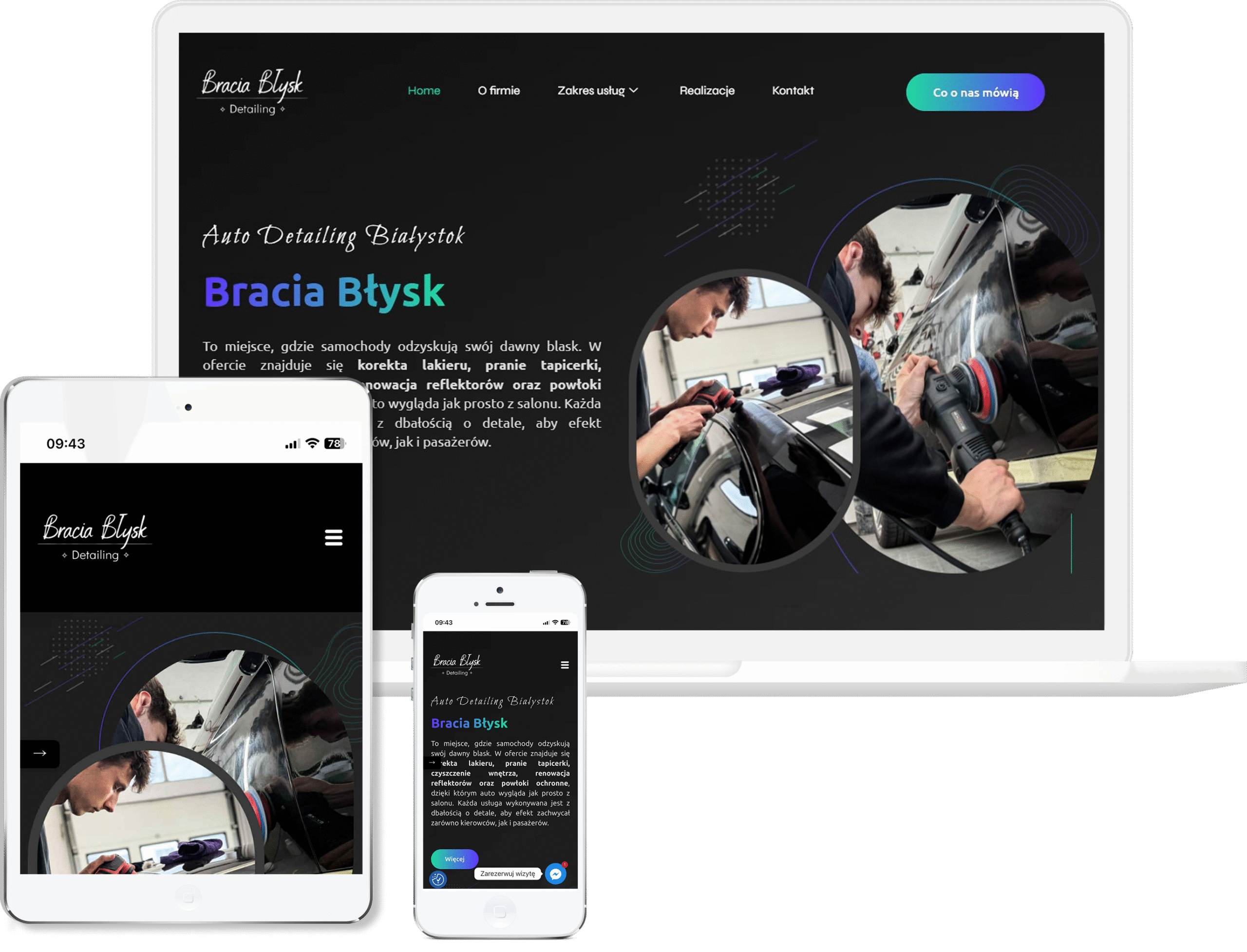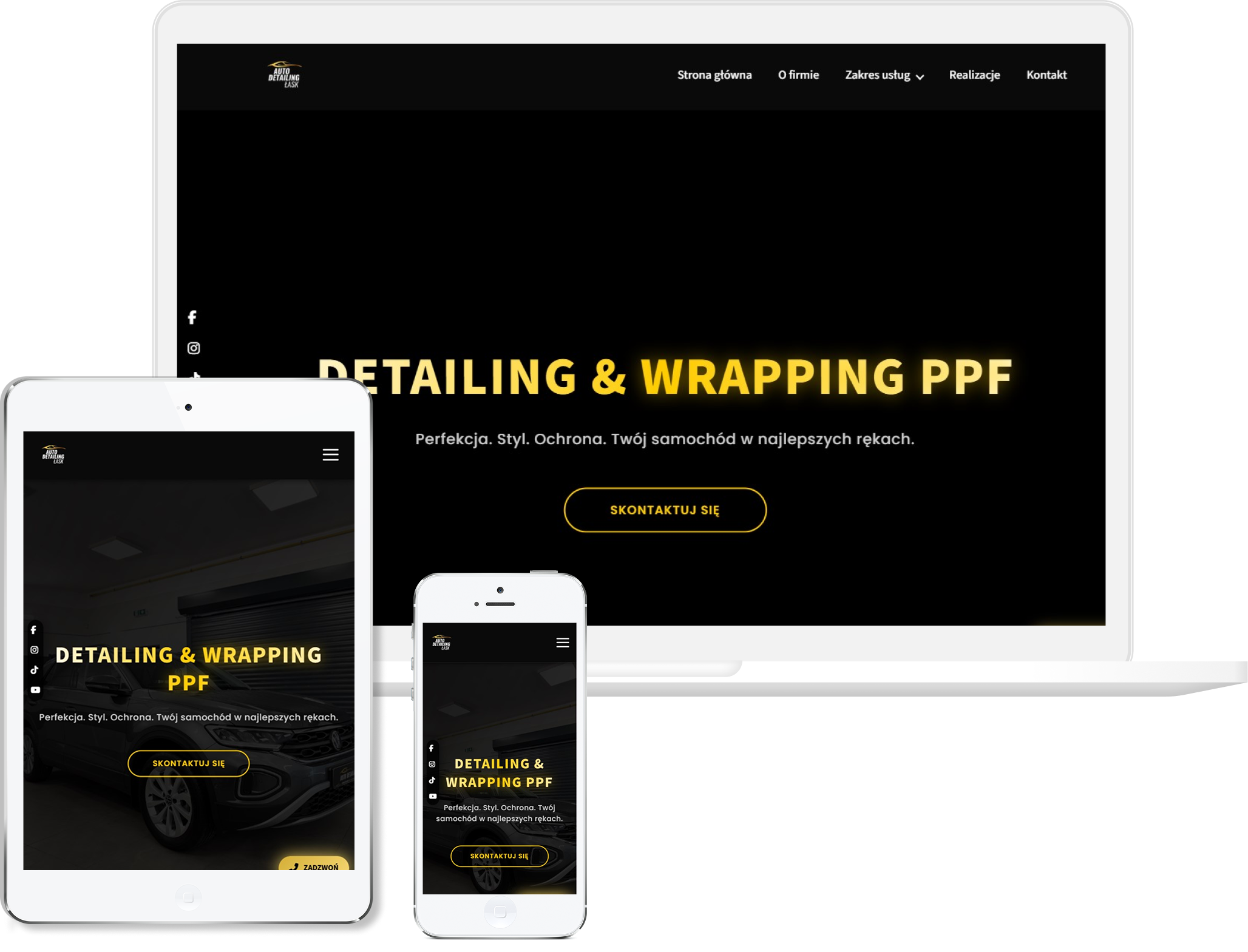 Projekt tej strony opracowaliśmy tak, aby od razu oddawała klimat warsztatu, w którym liczy się precyzja, technika i realne efekty pracy. Postawiliśmy na mocniejszą, kontrastową estetykę, która dobrze podkreśla charakter usług i pozwala wyeksponować zdjęcia prezentujące jakość detailingu. Całość ułożyliśmy w prostą, konkretną strukturę — tak, żeby użytkownik natychmiast widział kluczowe usługi, efekty oraz możliwość szybkiego kontaktu. Zadbaliśmy o to, by cała oferta była przejrzysta, bez zbędnych ozdobników, bo klienci szukający detailingu chcą szybko sprawdzić, komu powierzają auto. Duży nacisk położyliśmy na prezentację realizacji przed/po, bo to właśnie wizualne dowody pokazują poziom warsztatu. Strona działa świetnie na telefonach dzięki dopracowanej responsywności, co jest ważne, bo większość klientów trafia na nią mobilnie. Ostatecznie powstała witryna, która prezentuje firmę jako miejsce, gdzie samochody odzyskują perfekcyjny wygląd dzięki doświadczeniu i dokładnej pracy.