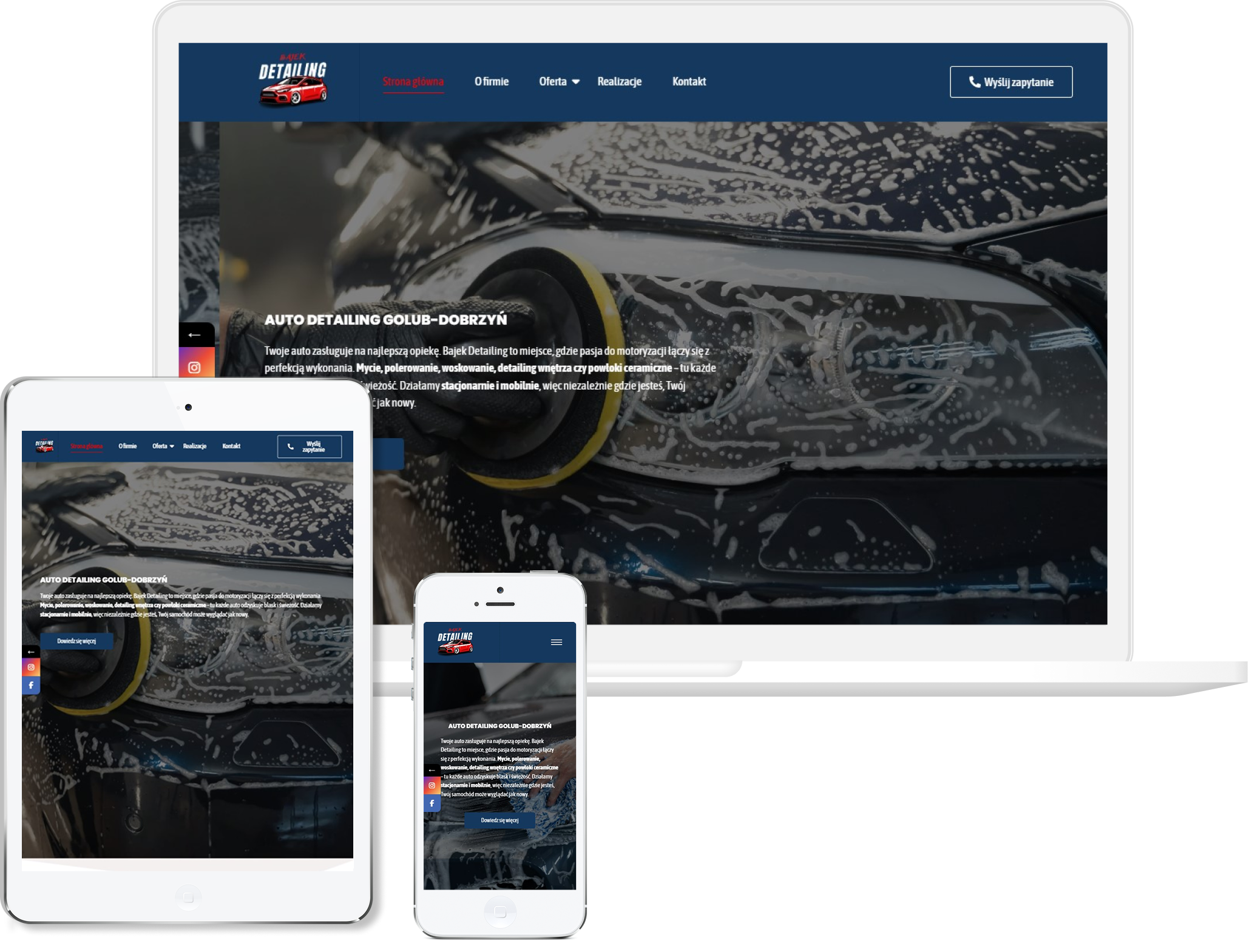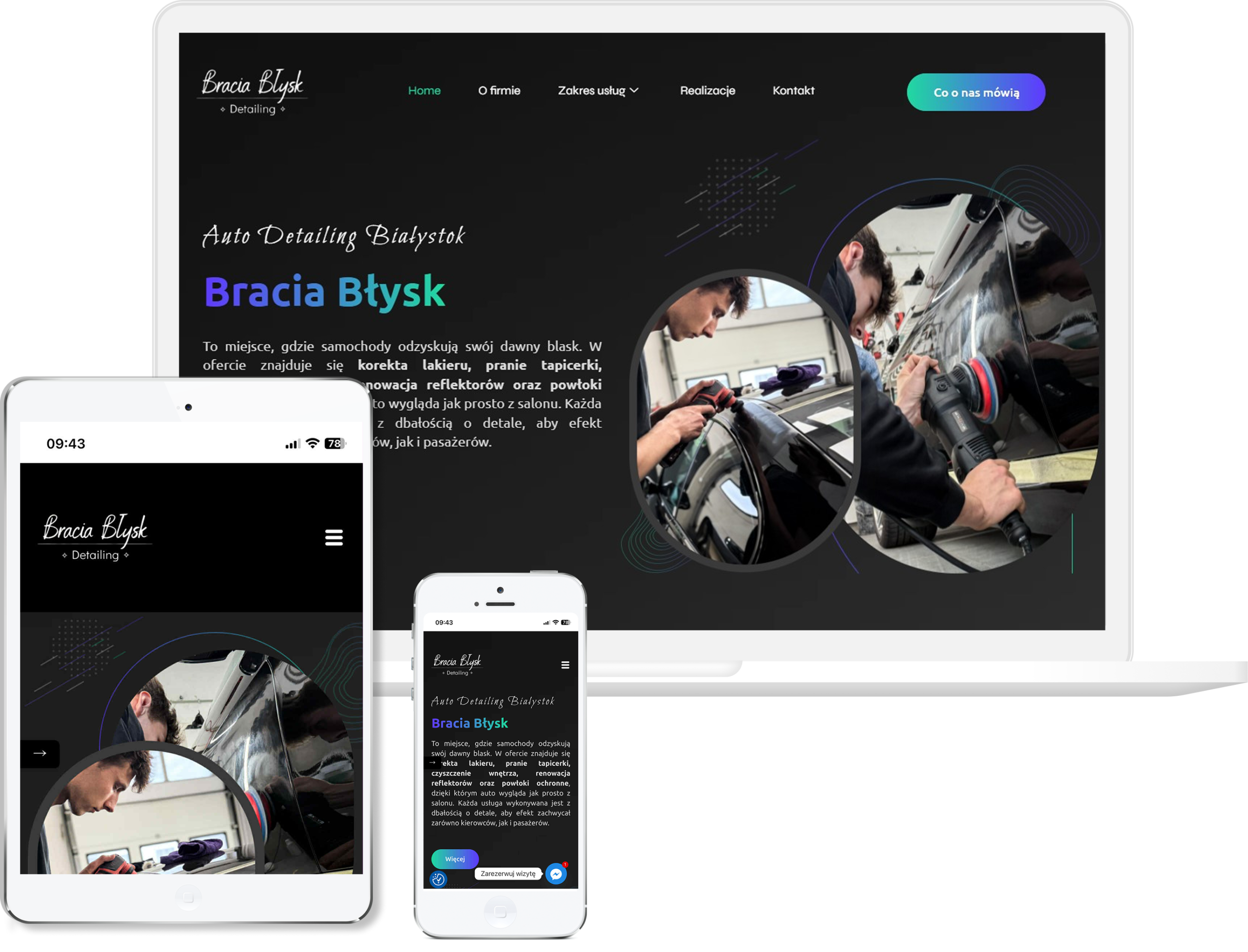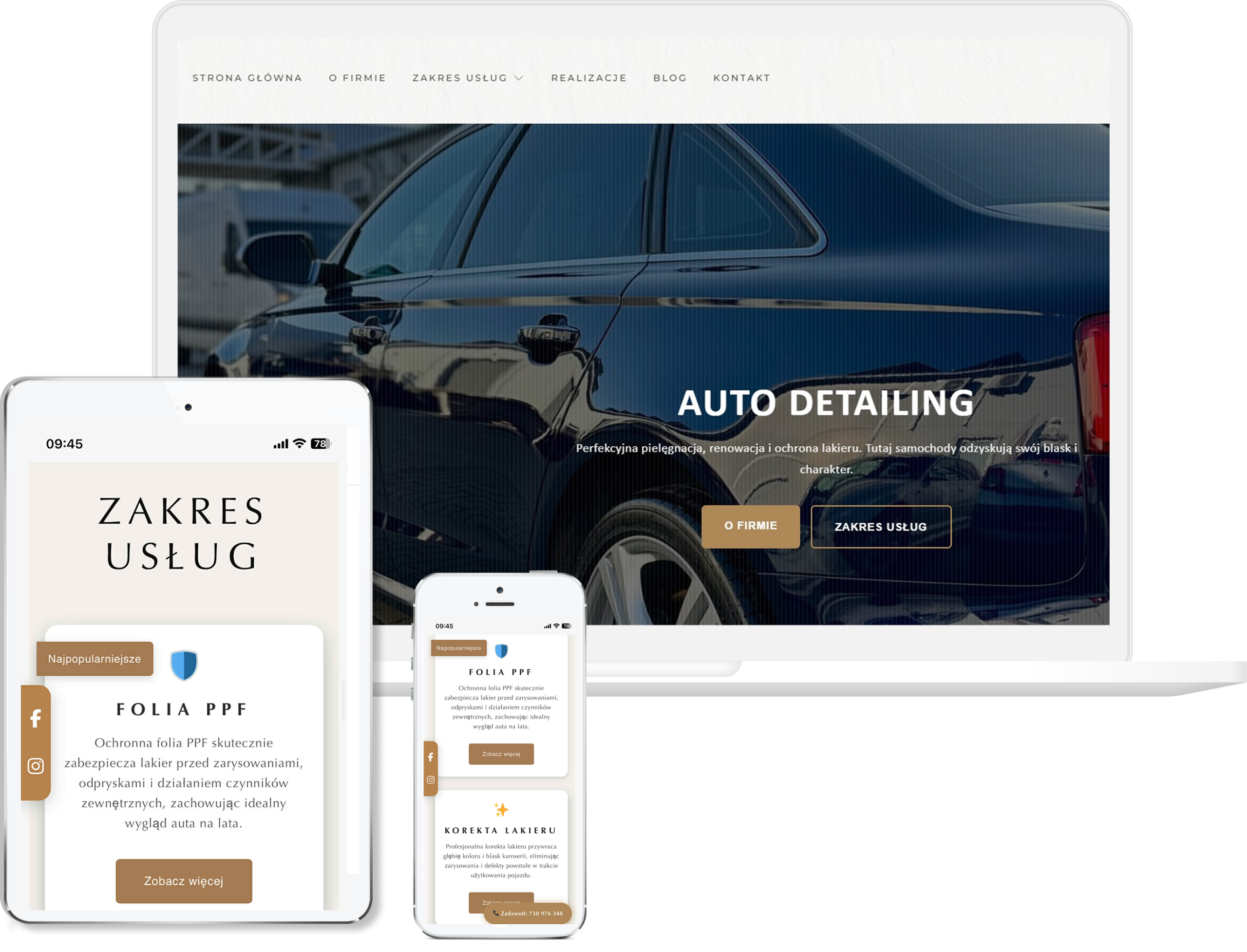 Projekt tej strony opracowaliśmy tak, aby od razu oddawała klimat warsztatu, w którym liczy się precyzja, technika i realne efekty pracy. Postawiliśmy na mocniejszą, kontrastową estetykę, która dobrze podkreśla charakter usług i pozwala wyeksponować zdjęcia prezentujące jakość detailingu. Całość ułożyliśmy w prostą, konkretną strukturę — tak, żeby użytkownik natychmiast widział kluczowe usługi, efekty oraz możliwość szybkiego kontaktu. Zadbaliśmy o to, by cała oferta była przejrzysta, bez zbędnych ozdobników, bo klienci szukający detailingu chcą szybko sprawdzić, komu powierzają auto. Duży nacisk położyliśmy na prezentację realizacji przed/po, bo to właśnie wizualne dowody pokazują poziom warsztatu. Strona działa świetnie na telefonach dzięki dopracowanej responsywności, co jest ważne, bo większość klientów trafia na nią mobilnie. Ostatecznie powstała witryna, która prezentuje firmę jako miejsce, gdzie samochody odzyskują perfekcyjny wygląd dzięki doświadczeniu i dokładnej pracy.