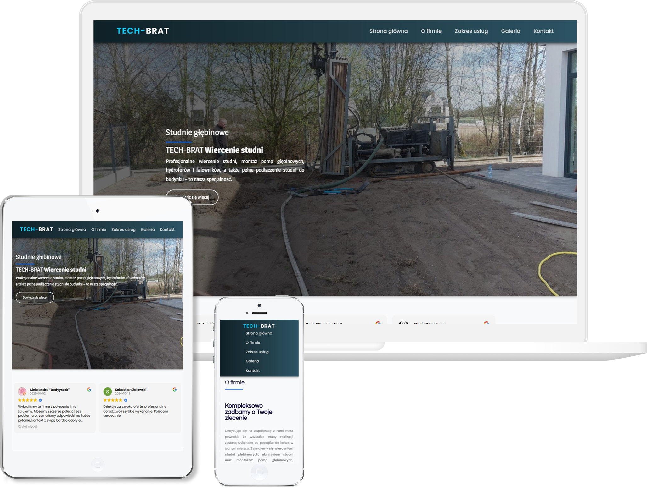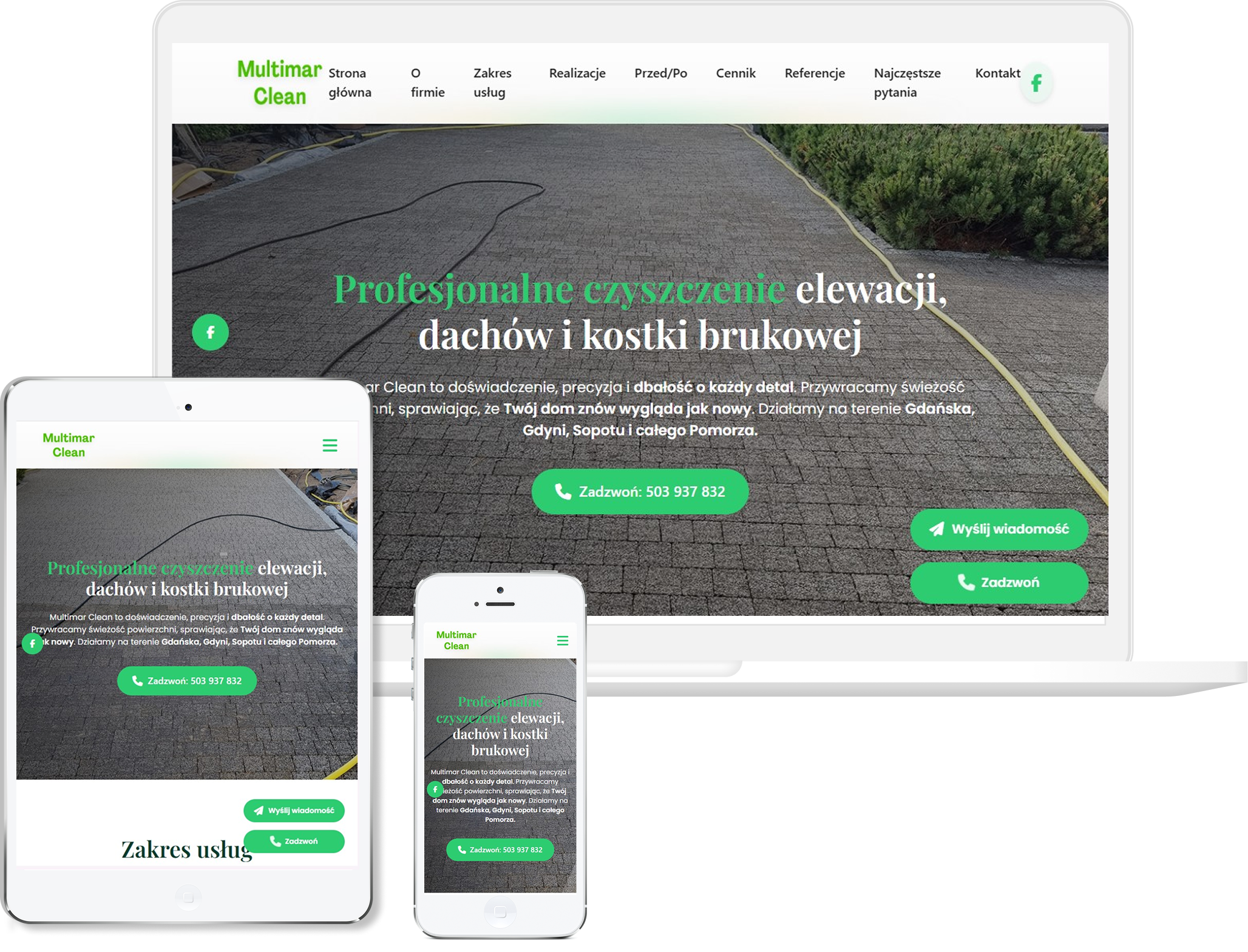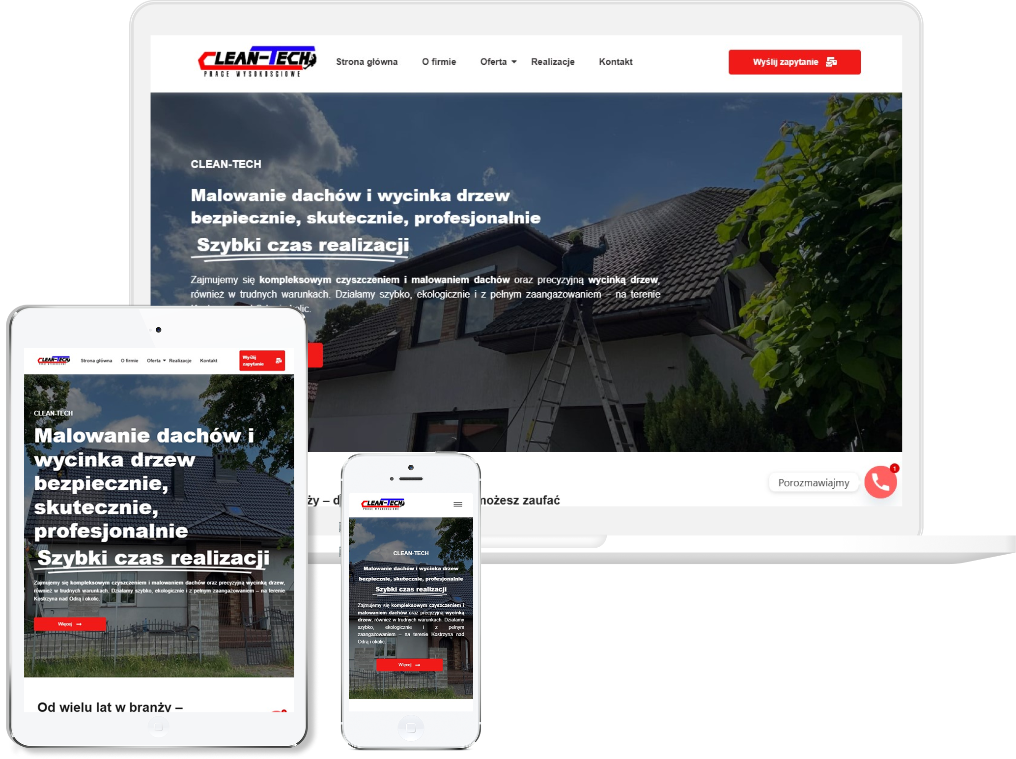 Duży nacisk położyliśmy na prezentację realizacji, bo to właśnie zdjęcia najlepiej pokazują skuteczność wykonywanych prac. Stronę dopracowaliśmy pod kątem mobilnym, żeby była wygodna dla klientów przeglądających ją na telefonie między obowiązkami. Efekt końcowy to przejrzysta i funkcjonalna witryna, która buduje zaufanie i podkreśla profesjonalizm firmy od pierwszego kontaktu.