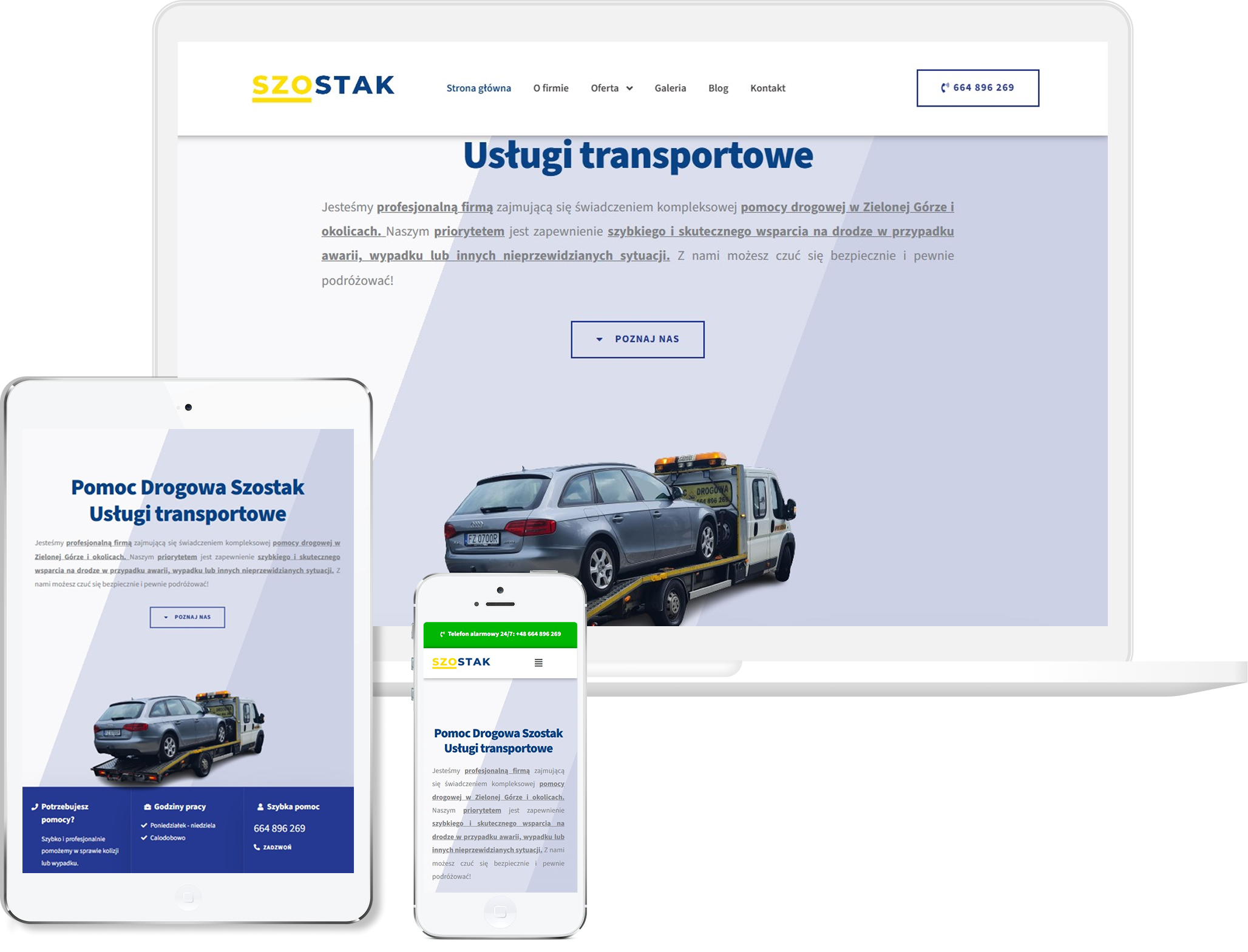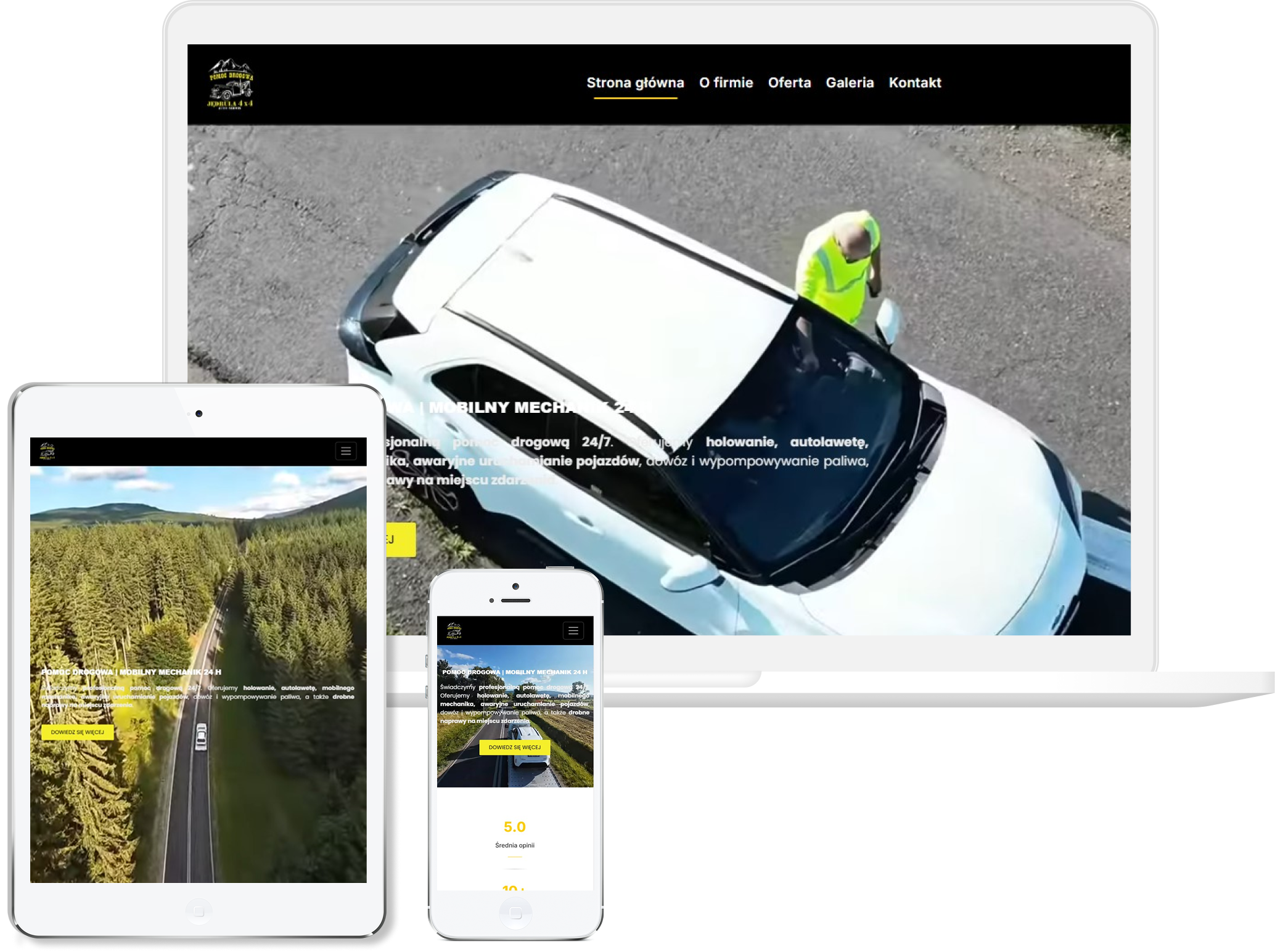 Postawiliśmy na wyraźne kontrasty, mocne CTA i układ, który bez zbędnych ozdób prowadzi użytkownika prosto do najważniejszych informacji — numeru telefonu, zakresu usług i dostępności. Całą konstrukcję strony stworzyliśmy pod sytuacje awaryjne, dlatego wszystkie kluczowe elementy są duże, czytelne i widoczne od razu po wejściu. Zadbaliśmy szczególnie o mobilną wersję, bo większość klientów szuka pomocy na telefonie, często stojąc przy drodze.