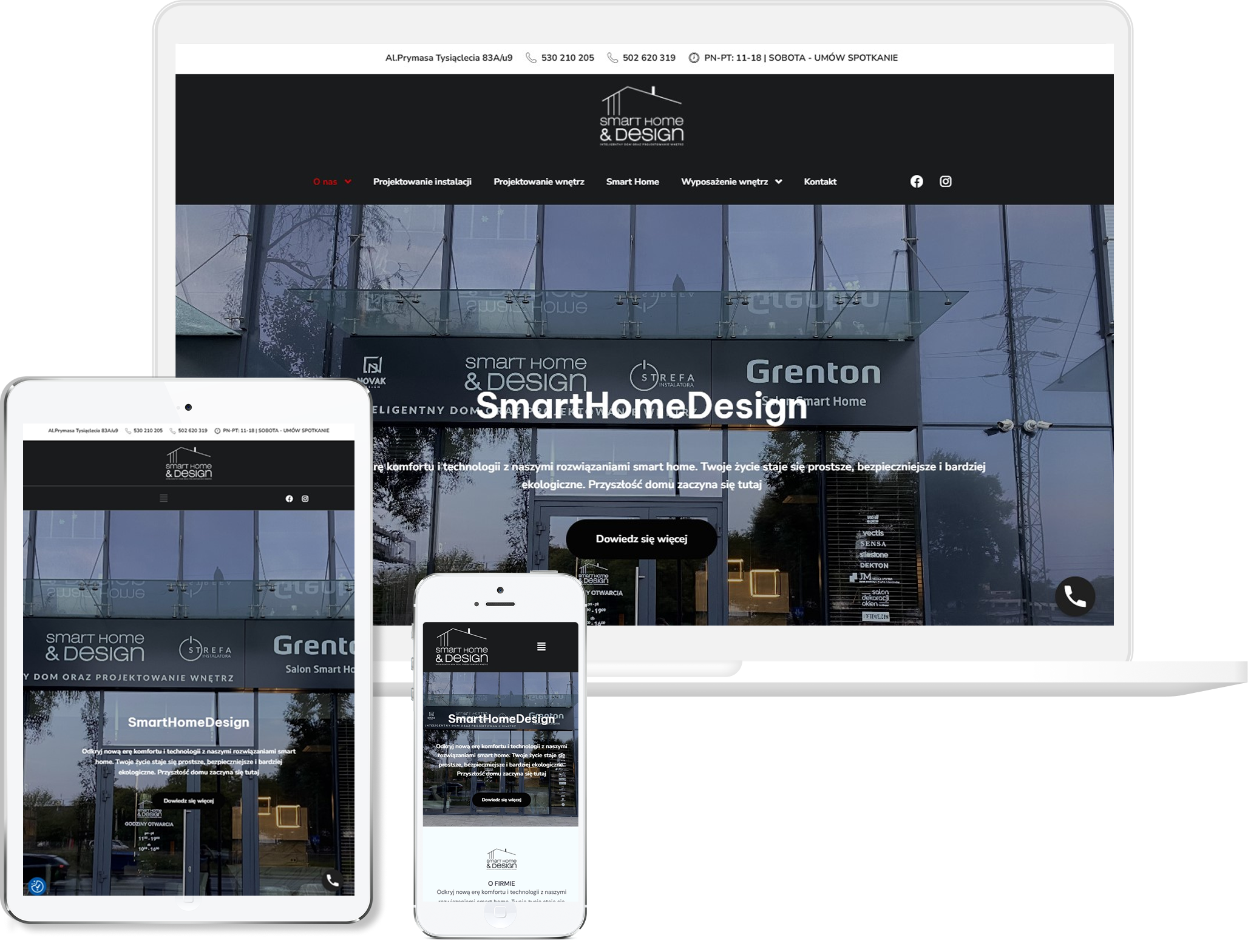 Projekt został przygotowany tak, aby od pierwszego spojrzenia kojarzył się z inteligentnymi systemami i nową generacją domowej automatyki. Postawiliśmy na minimalistyczny, futurystyczny klimat, który podkreśla innowacyjność rozwiązań smart home i pokazuje markę jako eksperta od zaawansowanych instalacji. Cały układ zbudowaliśmy tak, aby użytkownik płynnie przechodził przez scenariusze zastosowań, a nie tylko listę funkcji, bo klienci szukają przede wszystkim komfortu i praktycznych korzyści.