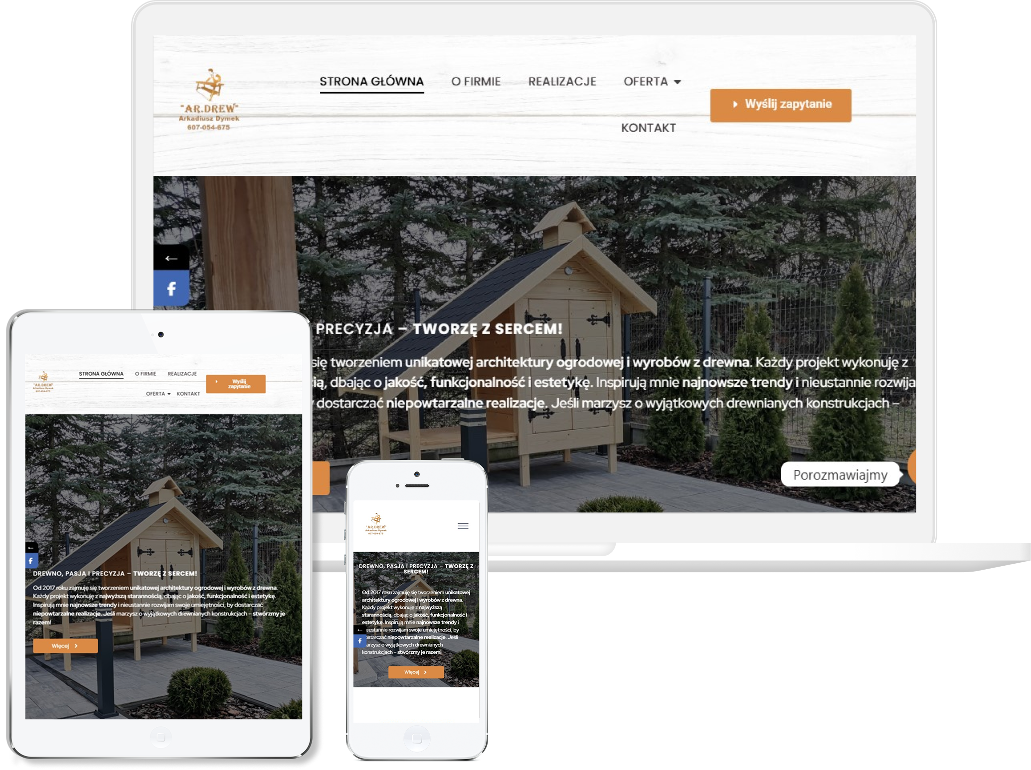 W tym projekcie zależało nam na stworzeniu strony, która w czytelny sposób pokazuje charakter firmy zajmującej się produkcją wędzarni oraz wyrobów z drewna. Postawiliśmy na naturalną, ciepłą estetykę, która podkreśla rzemieślnicze podejście i solidność wykonania, bo właśnie to jest fundamentem marki. Układ zaplanowaliśmy tak, aby użytkownik od razu mógł przejrzeć ofertę, zobaczyć różnorodność produktów i zrozumieć, czym wyróżniają się wędzarnie oraz elementy drewniane. Duży nacisk położyliśmy na prezentację zdjęć i realizacji, bo w tej branży to one najlepiej oddają jakość użytych materiałów i sposób wykończenia. Strona została dopracowana pod kątem responsywności, dzięki czemu świetnie działa również na telefonach, z których korzysta wielu klientów szukających inspiracji. Finalnie powstała solidna, przejrzysta witryna, która prezentuje firmę jako sprawdzonego producenta tworzącego wyroby z drewna z pasją i dbałością o szczegóły.