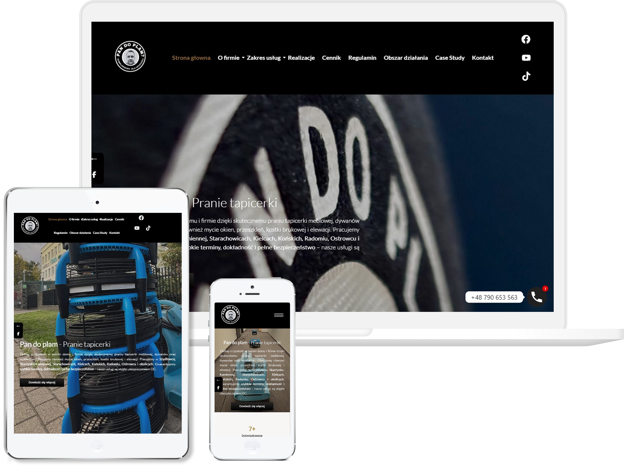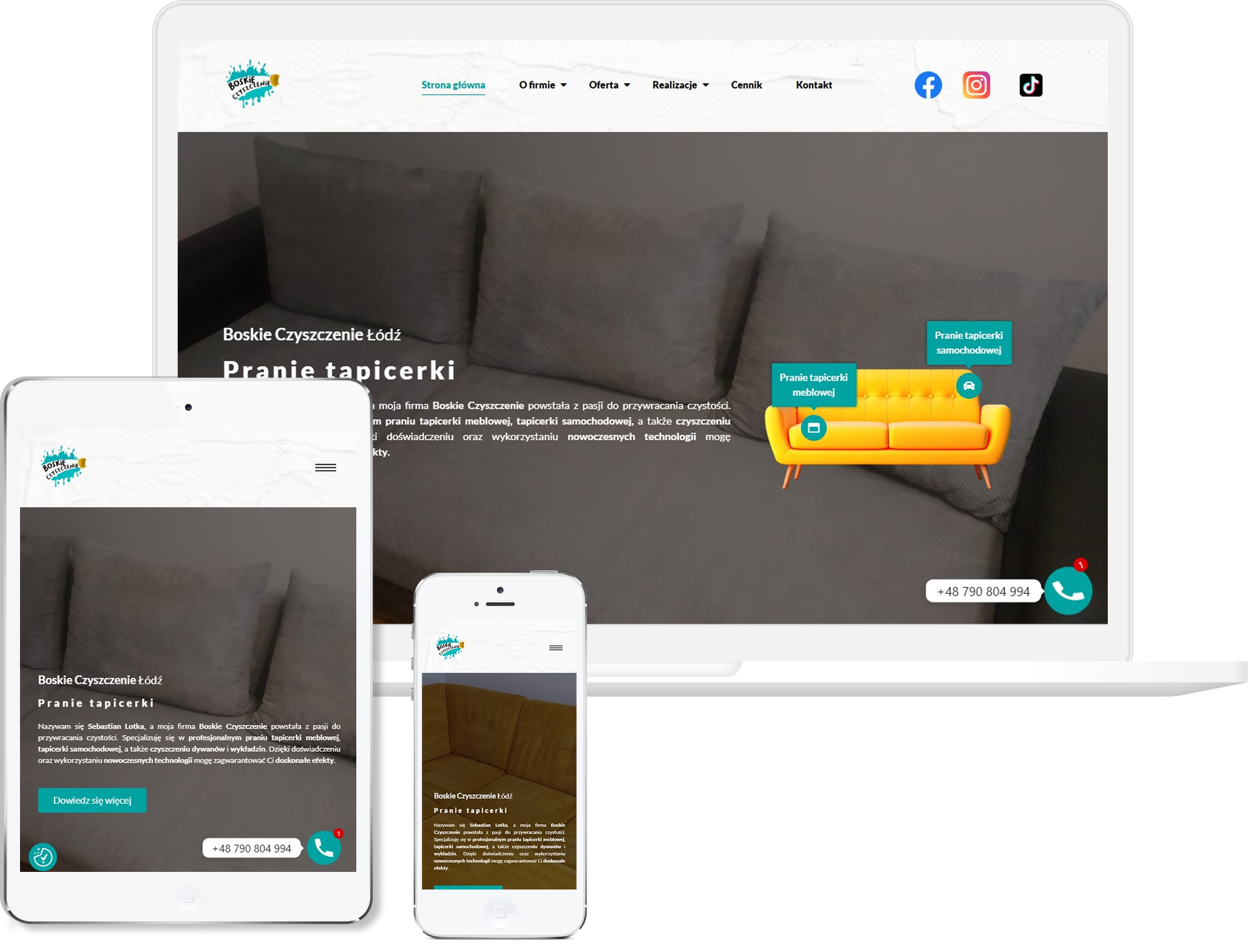 Postawiliśmy na lekką, jasną kolorystykę, która buduje poczucie świeżości i czystości, idealnie pasujące do charakteru marki. Układ uporządkowaliśmy tak, aby użytkownik od razu wiedział, jakie usługi są dostępne i mógł bez problemu przejść do kontaktu. Duży nacisk położyliśmy na czytelność sekcji oraz intuicyjną nawigację, bo w tej branży liczy się prostota i szybkość podjęcia decyzji. Stronę dopracowaliśmy pod kątem responsywności, dzięki czemu działa równie dobrze na telefonach, jak na komputerach.