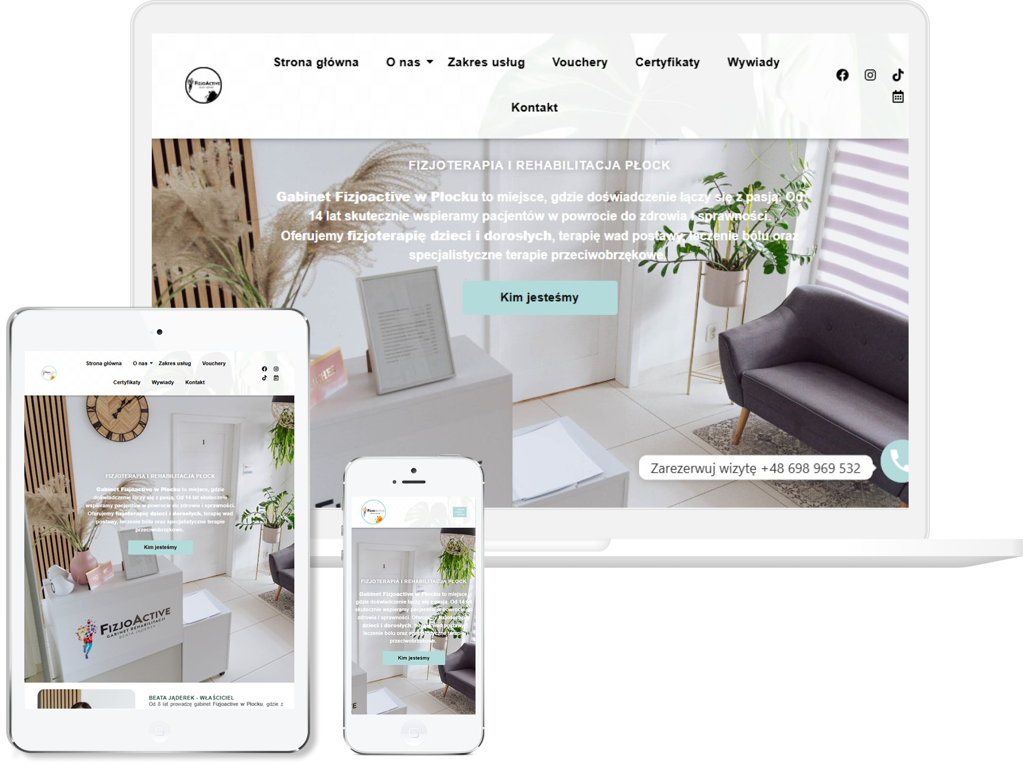 Strona fizjoactiveplock.pl została przez nas zaprojektowana jako nowoczesna i czytelna wizytówka gabinetu fizjoterapii, który stawia na indywidualne podejście i profesjonalną opiekę. Przyjęliśmy spokojną, medyczną estetykę, żeby od razu zbudować wrażenie bezpieczeństwa i kompetencji, tak istotne w tej branży. Cały układ opracowaliśmy tak, by pacjent szybko znalazł informacje o terapiach, specjalistach i dostępnych formach pomocy. Zadbaliśmy też o przejrzystość opisów usług, bo osoby szukające fizjoterapeuty oczekują konkretów i jasnych wskazówek.