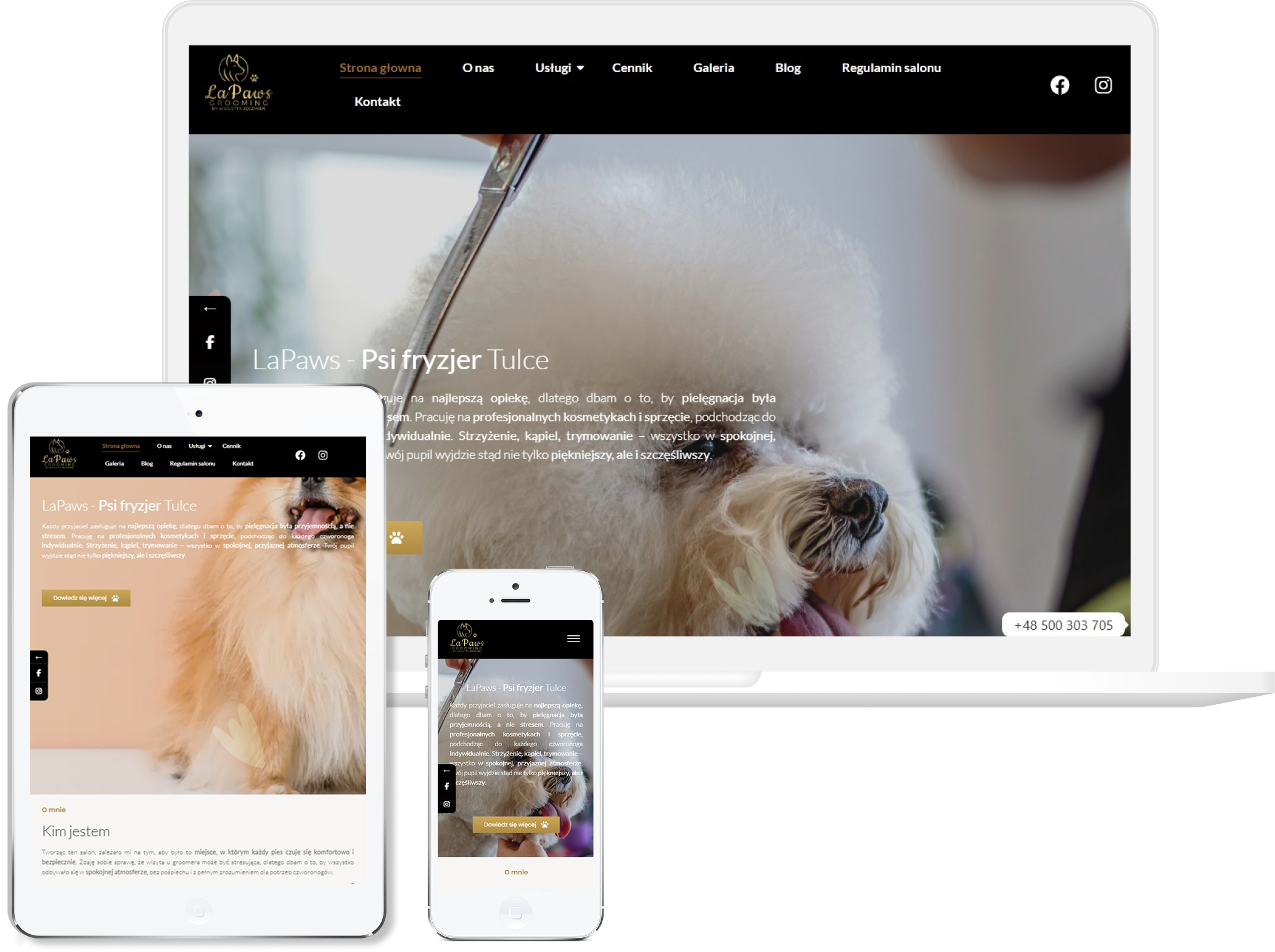 Postawiliśmy na jasną, lekką estetykę, która buduje od razu pozytywne emocje i zaufanie właścicieli zwierząt. Układ ułożyliśmy tak, aby każdy użytkownik mógł szybko znaleźć informacje o usługach, cenach i dostępnych terminach, bez przekopywania się przez zbędne treści. Szczególną uwagę zwróciliśmy na prezentację zdjęć, bo to one najlepiej pokazują atmosferę i jakość pracy groomera.