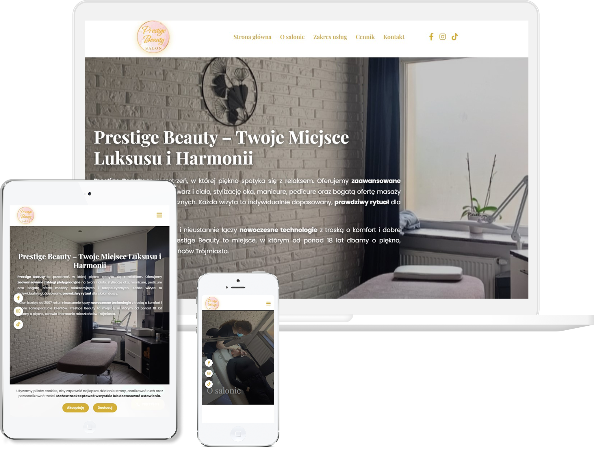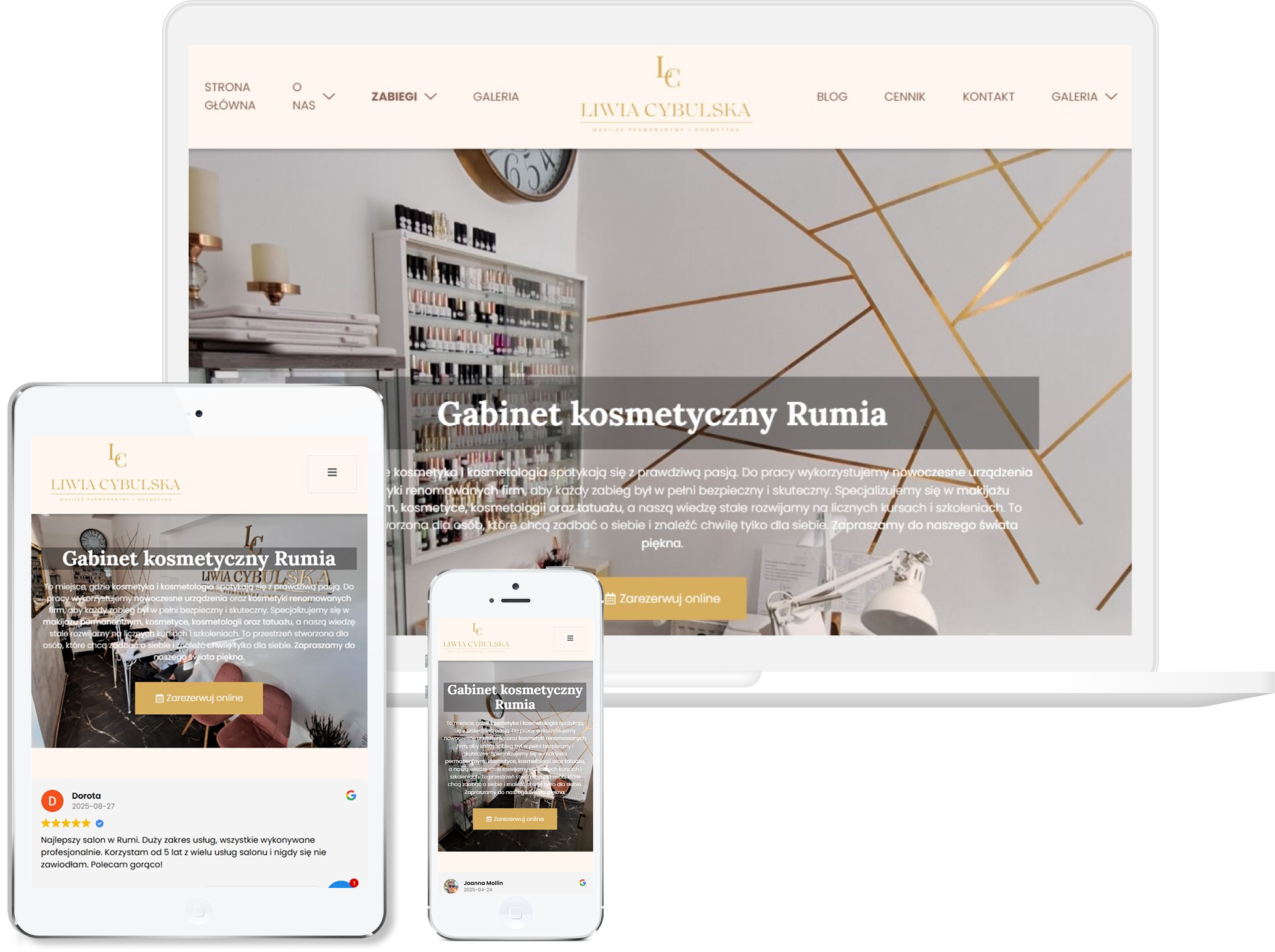 W tym projekcie skupiliśmy się na stworzeniu eleganckiej, harmonijnej przestrzeni, która oddaje charakter salonu kosmetycznego i buduje poczucie komfortu już od pierwszych sekund. Postawiliśmy na jasną, lekką estetykę, która podkreśla czystość, subtelność i wysoki standard usług. Układ zaplanowaliśmy tak, aby użytkowniczka mogła szybko przejrzeć zabiegi, sprawdzić szczegóły oferty i bez problemu przejść do kontaktu lub rezerwacji. Ważną rolę odegrały tu także zdjęcia, bo to one najlepiej oddają klimat salonu i profesjonalizm wykonywanych zabiegów. Całość została dopracowana pod kątem wygody przeglądania na telefonach, co jest kluczowe w branży beauty. Efektem jest spokojna, stylowa witryna, która zachęca do wizyty i prezentuje salon jako miejsce pełne dbałości, estetyki i indywidualnej opieki.