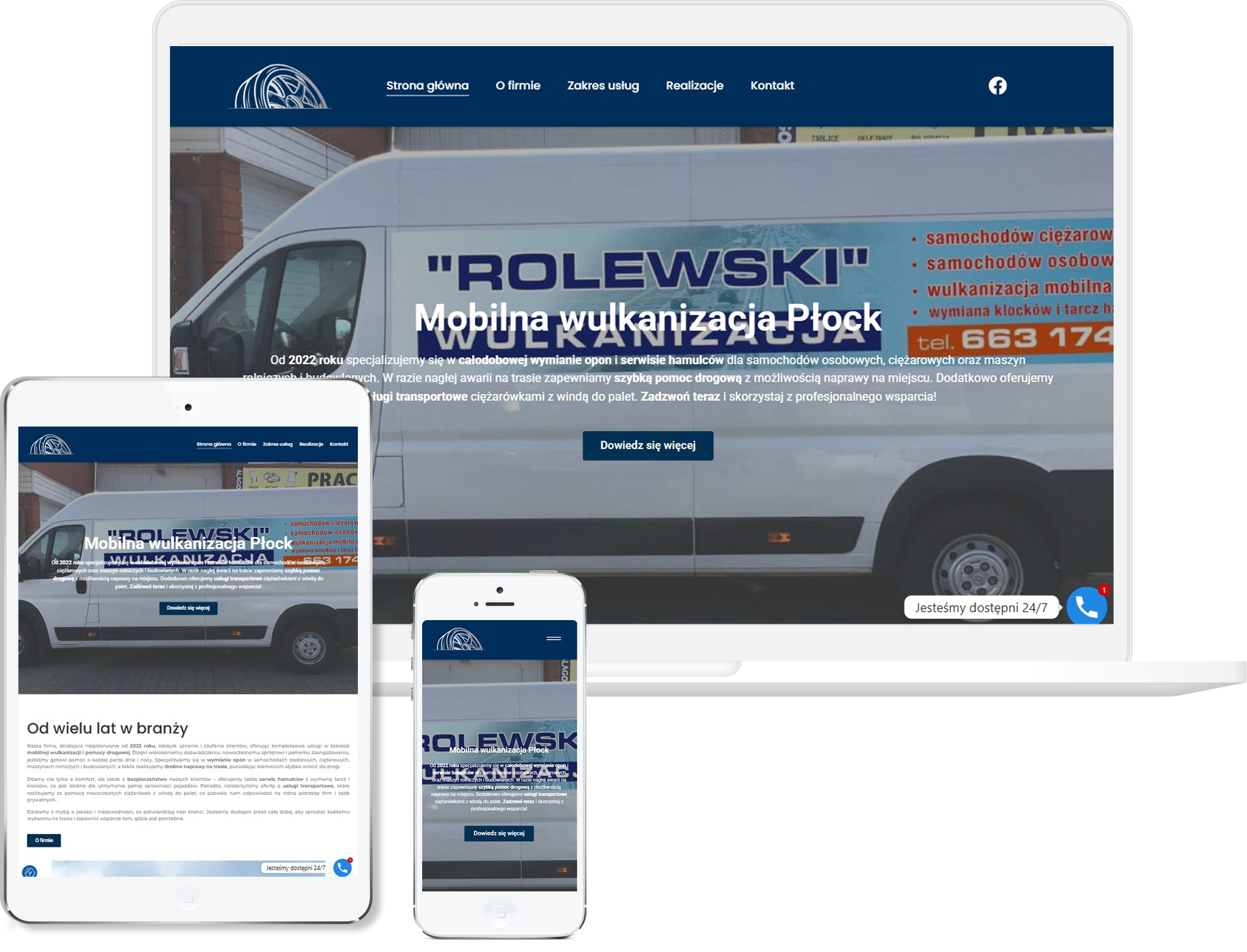 Sekcje opisujące usługi są krótkie i konkretne, bo w tej branży liczy się przede wszystkim szybkość decyzji. Strona działa świetnie na telefonach, co jest kluczowe, bo kierowcy korzystają z niej głównie w trasie. Finalnie powstała praktyczna, szybka wizytówka, która jasno pokazuje, że pomoc jest mobilna, dostępna i gotowa reagować od razu.