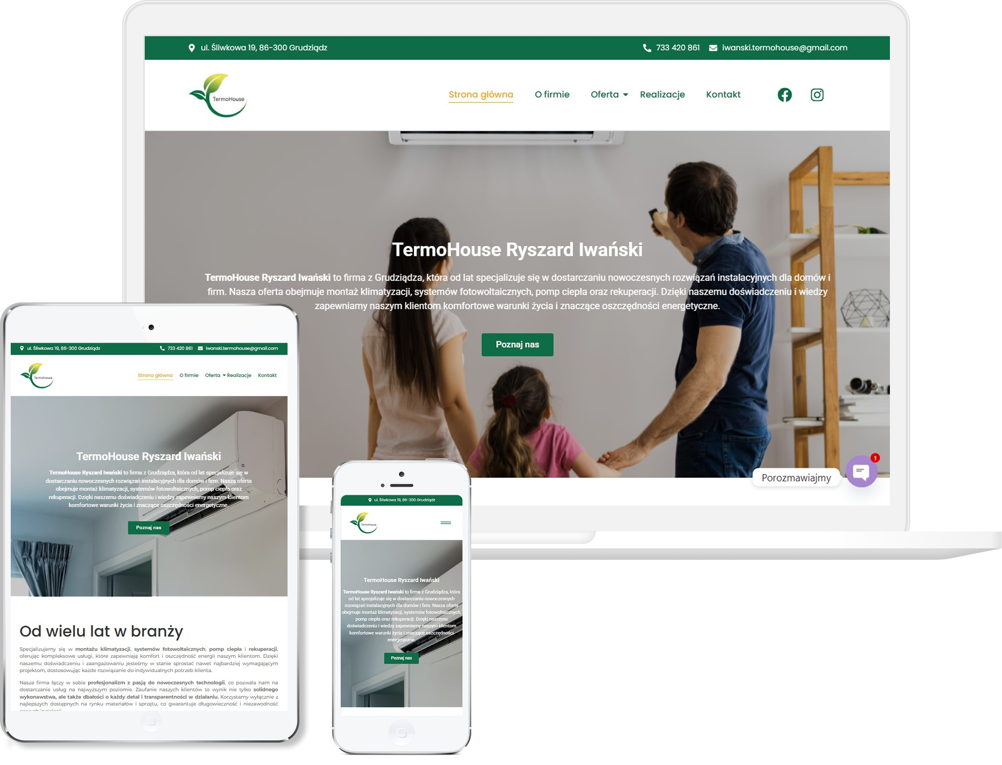 Na stronie termohouse-iwanski.pl przygotowano kompletny, profesjonalny projekt prezentujący ofertę montażu i serwisu klimatyzacji w sposób nowoczesny i przejrzysty. Cała struktura została zaplanowana tak, aby klient od razu rozumiał zakres usług i mógł szybko skontaktować się z wykonawcą. Witryna została zoptymalizowana pod urządzenia mobilne oraz szybkość działania, co ma ogromne znaczenie w branży instalacyjnej. Dodano szczegółowe sekcje ofertowe, realizacje oraz elementy budujące wiarygodność, dzięki czemu strona wzmacnia wizerunek specjalisty. Całość została przygotowana zgodnie z zasadami SEO, aby skutecznie zwiększać widoczność lokalną i pozyskiwać nowych klientów zainteresowanych montażem klimatyzacji.