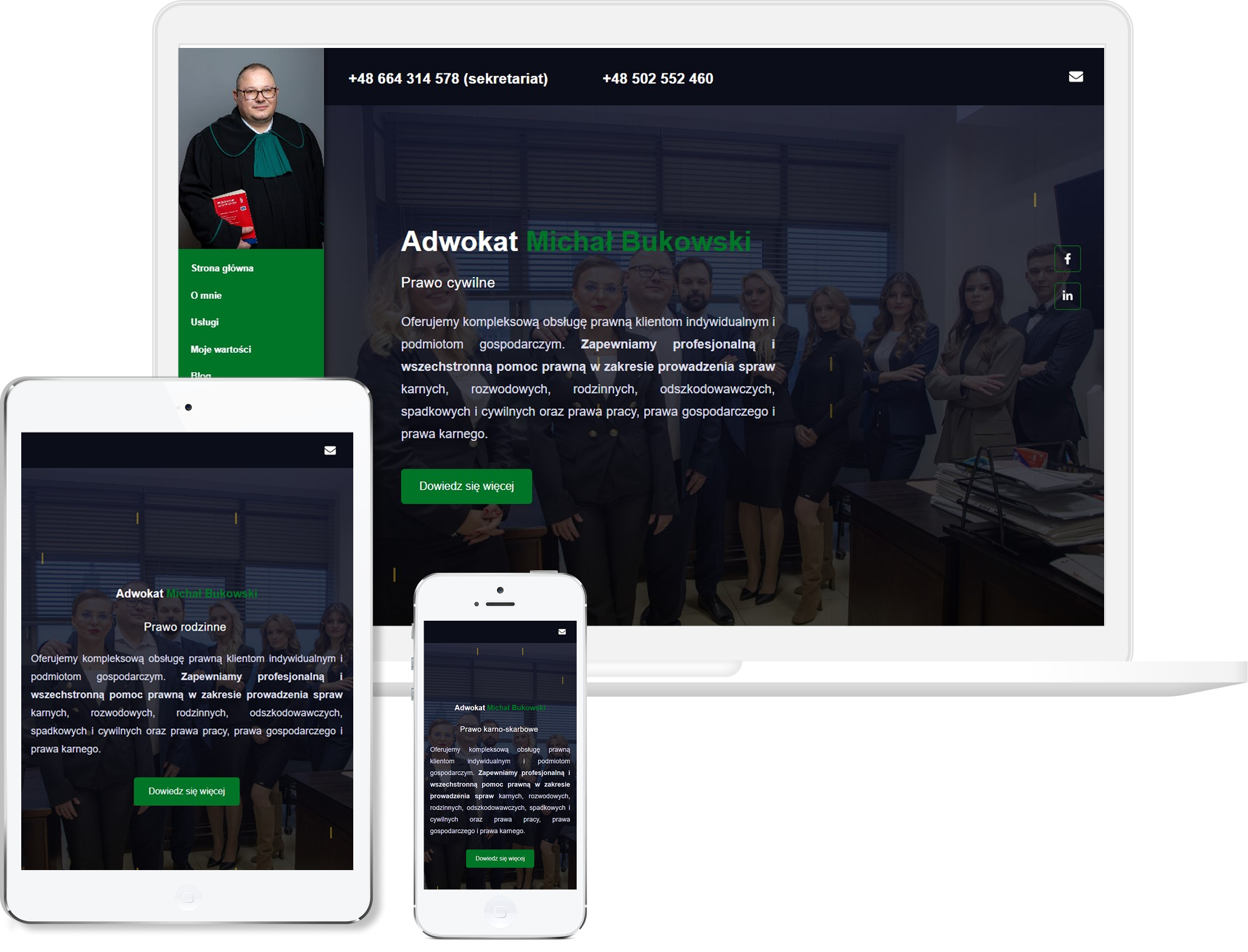 Strona kancelarii Bukowski w Kielcach została zaprojektowana tak, by klient od razu wiedział, z jakimi sprawami może zwrócić się do adwokata. Jasny podział usług oraz wyraźna prezentacja specjalizacji ułatwiają orientację nawet osobom, które wcześniej nie miały do czynienia z prawem. Dzięki czytelnemu nagłówkowi i schludnej strukturze zyskuje wizerunek kancelarii godnej zaufania i profesjonalnej. Zamieszczenie danych kontaktowych w widocznym miejscu sprawia, że umówienie konsultacji jest szybkie i intuicyjne.