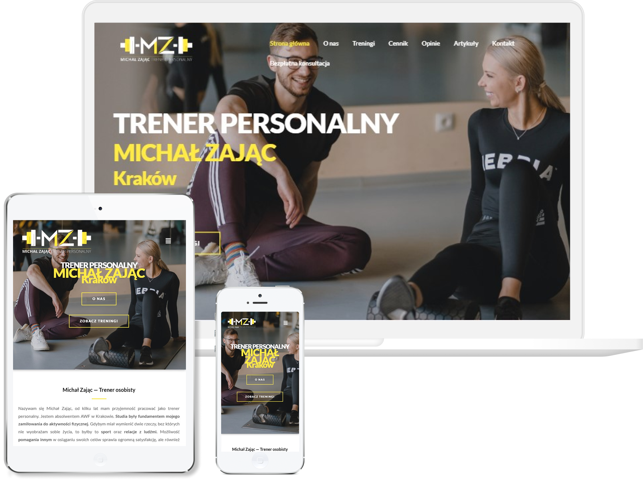 została przygotowana tak, aby od razu pokazywać energię, zaangażowanie i indywidualne podejście trenera personalnego. Postawiliśmy na mocne, motywacyjne akcenty wizualne, które podkreślają sportowy charakter i zachęcają do działania. Układ zaprojektowaliśmy tak, aby użytkownik szybko znalazł informacje o ofercie, specjalizacjach i możliwości umówienia pierwszej konsultacji. Ważną rolę odgrywają tu zdjęcia i sekcja efektów, bo to one najlepiej pokazują realne rezultaty współpracy. Strona działa świetnie na urządzeniach mobilnych, co ma duże znaczenie dla osób przeglądających ofertę w biegu. Finalnie powstała nowoczesna, dynamiczna wizytówka, która buduje zaufanie i pokazuje trenera jako profesjonalistę gotowego poprowadzić klienta do konkretnych celów.