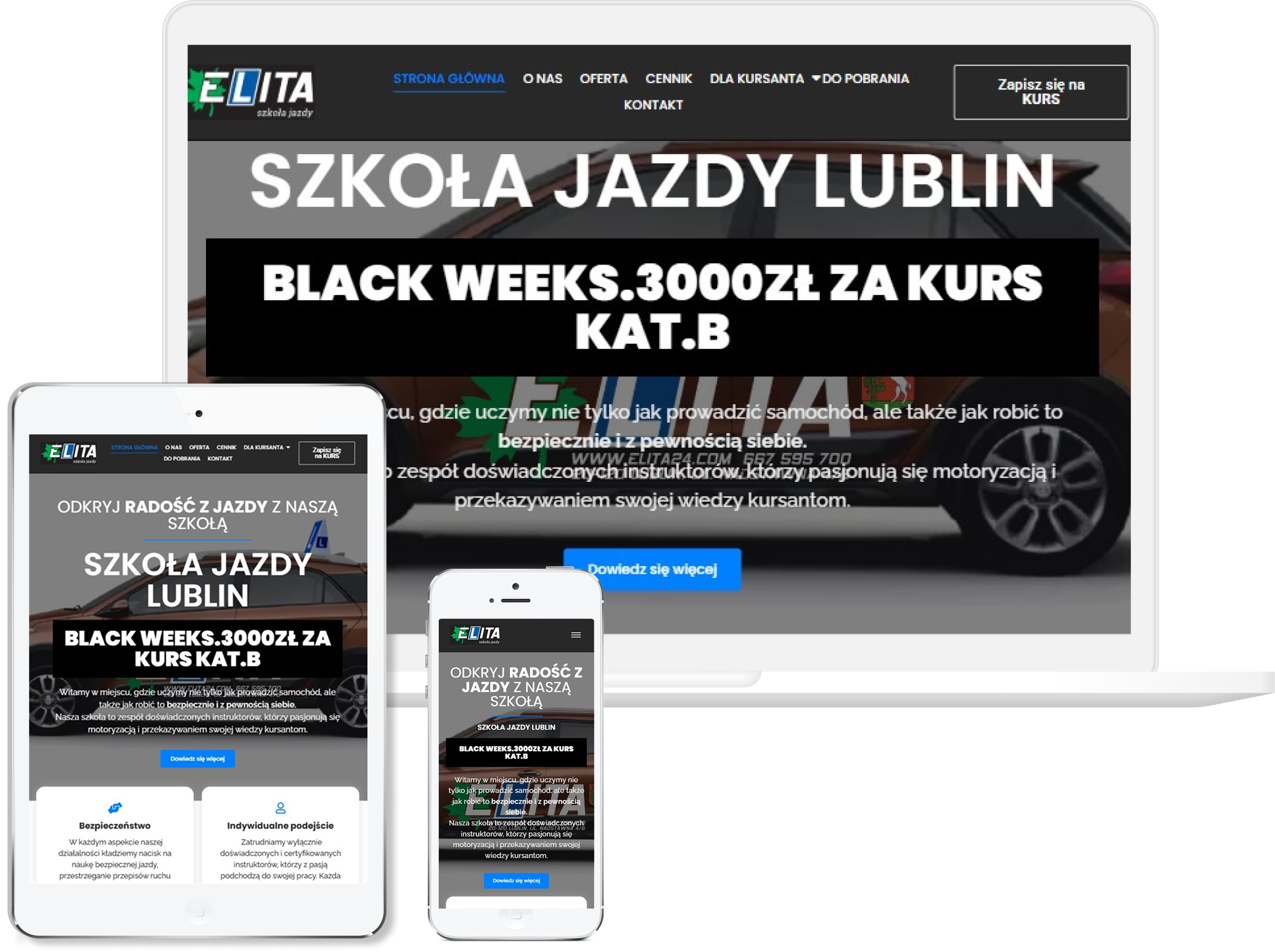 Zastosowaliśmy nowoczesną, energiczną estetykę, która buduje poczucie bezpieczeństwa i jednocześnie motywuje przyszłych kursantów do działania. Układ zaplanowaliśmy tak, aby użytkownik bez trudu znalazł informacje o kursach, terminach, formalnościach i możliwościach zapisu, bo w tej branży liczy się prostota i klarowna ścieżka. Duży nacisk położyliśmy na przejrzystość oferty oraz przedstawienie doświadczenia instruktorów, bo to właśnie te elementy decydują o wyborze szkoły. Strona została zoptymalizowana pod wygodne korzystanie na telefonach, co jest kluczowe, ponieważ wielu kursantów szuka szkoły jazdy mobilnie. Efektem jest dynamiczna, funkcjonalna witryna, która pokazuje Elita24 jako miejsce, gdzie kursanci uczą się pewnie, skutecznie i pod okiem profesjonalistów.