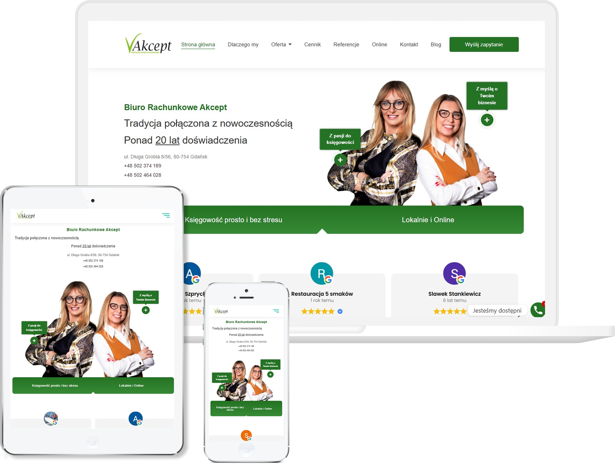 Strona AKCEPT łączy wieloletnie doświadczenie z nowoczesnym podejściem do księgowości, co od razu daje klientowi poczucie, że trafia do fachowców. Przejrzysta struktura oferty — od ksiąg handlowych, przez uproszczoną księgowość, po zakładanie spółek i obsługę międzynarodowego handlu — pokazuje szeroki zakres usług i ułatwia odnalezienie tego, czego klient potrzebuje. Wyraźne dane kontaktowe, adres i formularz „Wyślij zapytanie” sprawiają, że nawiązanie pierwszego kontaktu jest szybkie i proste.