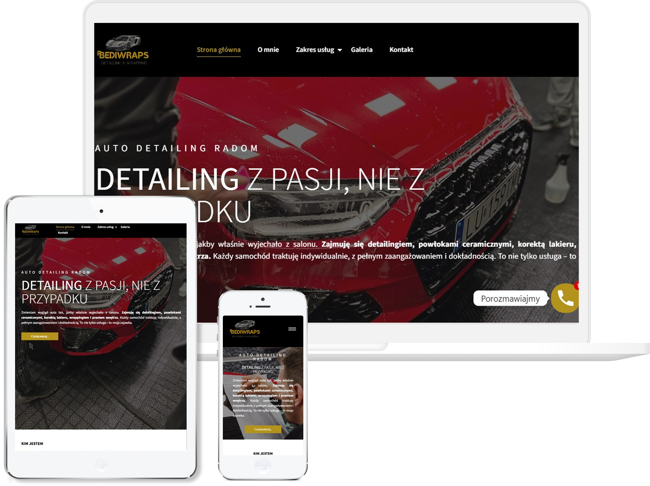 Strona bediwraps.pl została przez nas zaprojektowana jako nowoczesna, dynamiczna przestrzeń, która od razu oddaje charakter branży wrappingu. Postawiliśmy na ciemniejszą stylistykę i mocne akcenty, żeby podkreślić techniczny, precyzyjny klimat usług oraz uwydatnić realizacje. Cały układ zbudowaliśmy tak, aby użytkownik przechodził przez ofertę płynnie, bez zbędnych rozpraszaczy, skupiając się na tym, co najważniejsze — jakości wykonania.