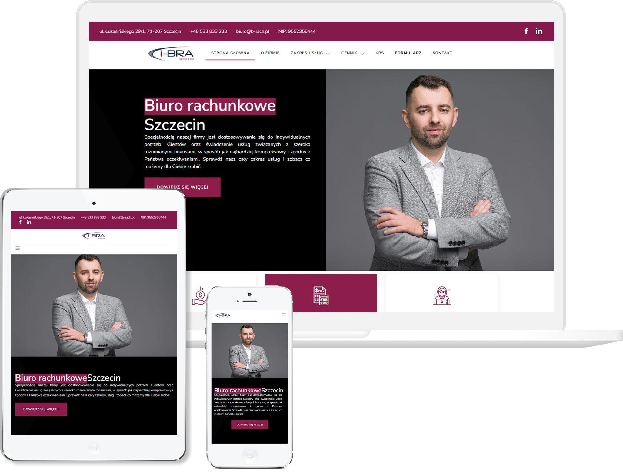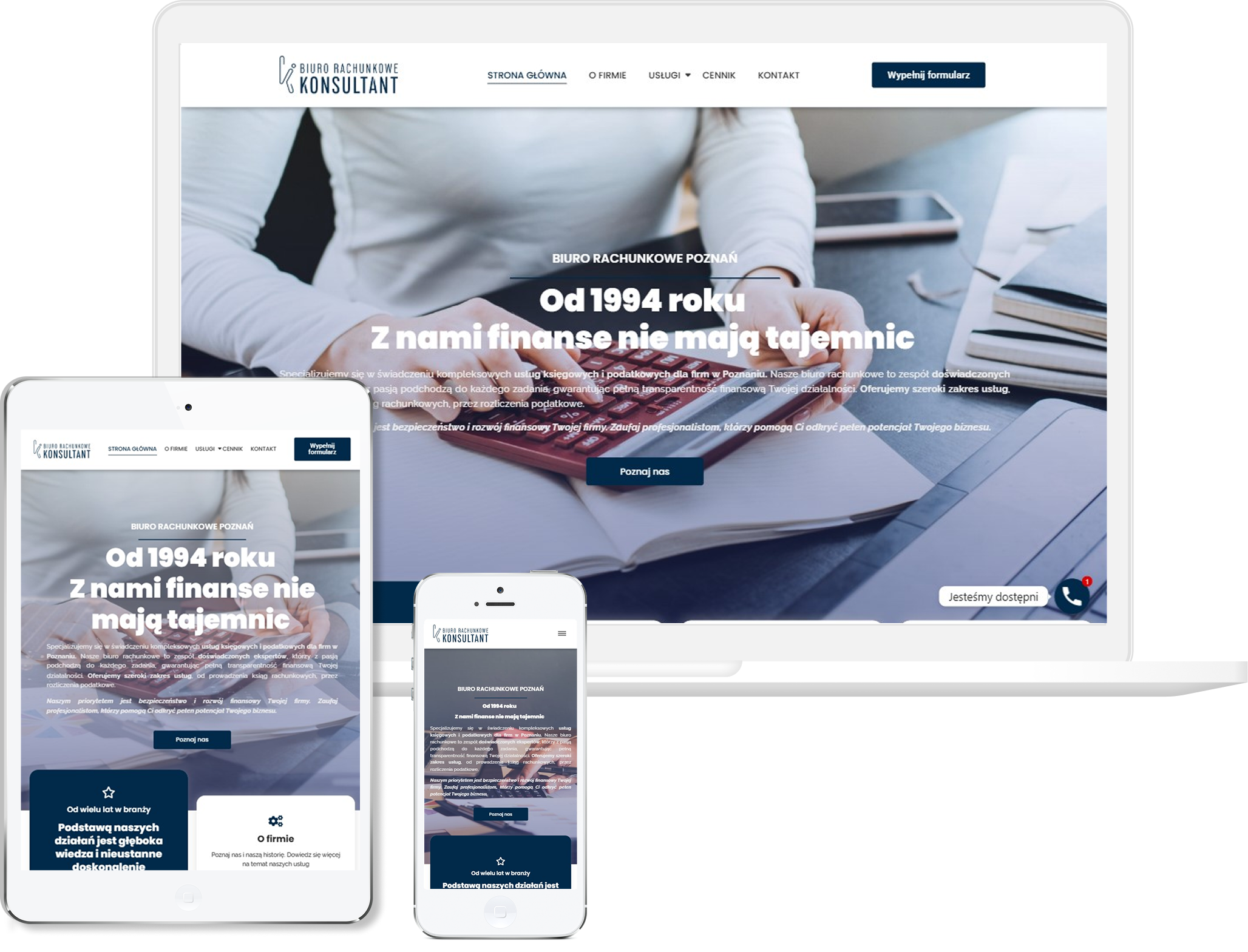 Została zbudowana tak, by od razu pokazać pełen zakres usług księgowo-rachunkowych — od prowadzenia ksiąg, przez kadry i płace, po zakładanie firmy i doradztwo — co pomaga klientowi natychmiast zorientować się, czy znajdzie tu to, czego potrzebuje. Przejrzysta nawigacja i logiczne menu ułatwiają poruszanie się po serwisie nawet osobom bez doświadczenia w księgowości.