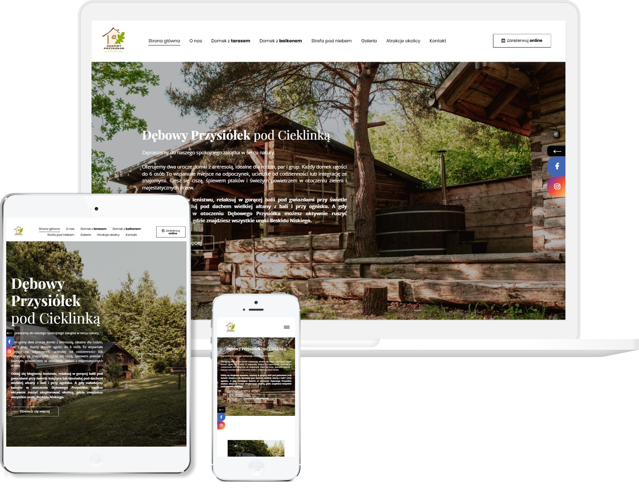Strona Dębowego Przysiółka wita odwiedzającego spokojem i obietnicą ucieczki od codziennego zgiełku — już od pierwszych zdań czuć, że tu chodzi o relaks i kontakt z naturą. Jasny, przemyślany układ oferty — z opcjami domków z tarasem albo balkonem, strefą relaksu, balią pod gwiazdami — pokazuje, że to nie przypadkowy nocleg, lecz przemyślane miejsce dla wymagających.