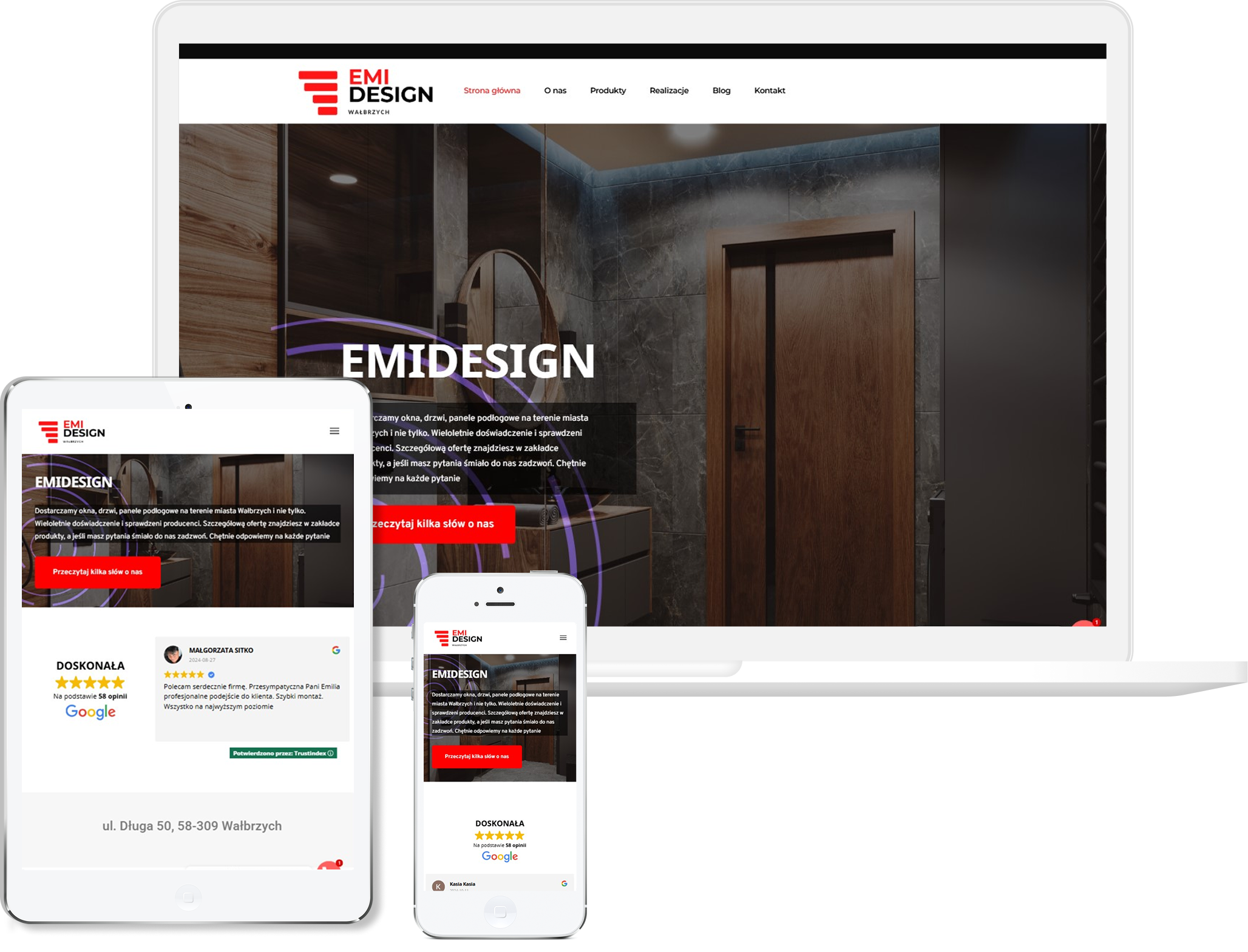 Układ ułożyliśmy tak, aby użytkownik szybko zobaczył realizacje, poznał ofertę i mógł bez problemu przejść do kontaktu. Zdjęcia grają tu kluczową rolę — to one pokazują poziom detalu i styl wykończeń. Strona została dopracowana pod urządzenia mobilne, aby działała wygodnie na każdym ekranie. Całość tworzy spójną, nowoczesną wizytówkę rzetelnego wykonawcy.
