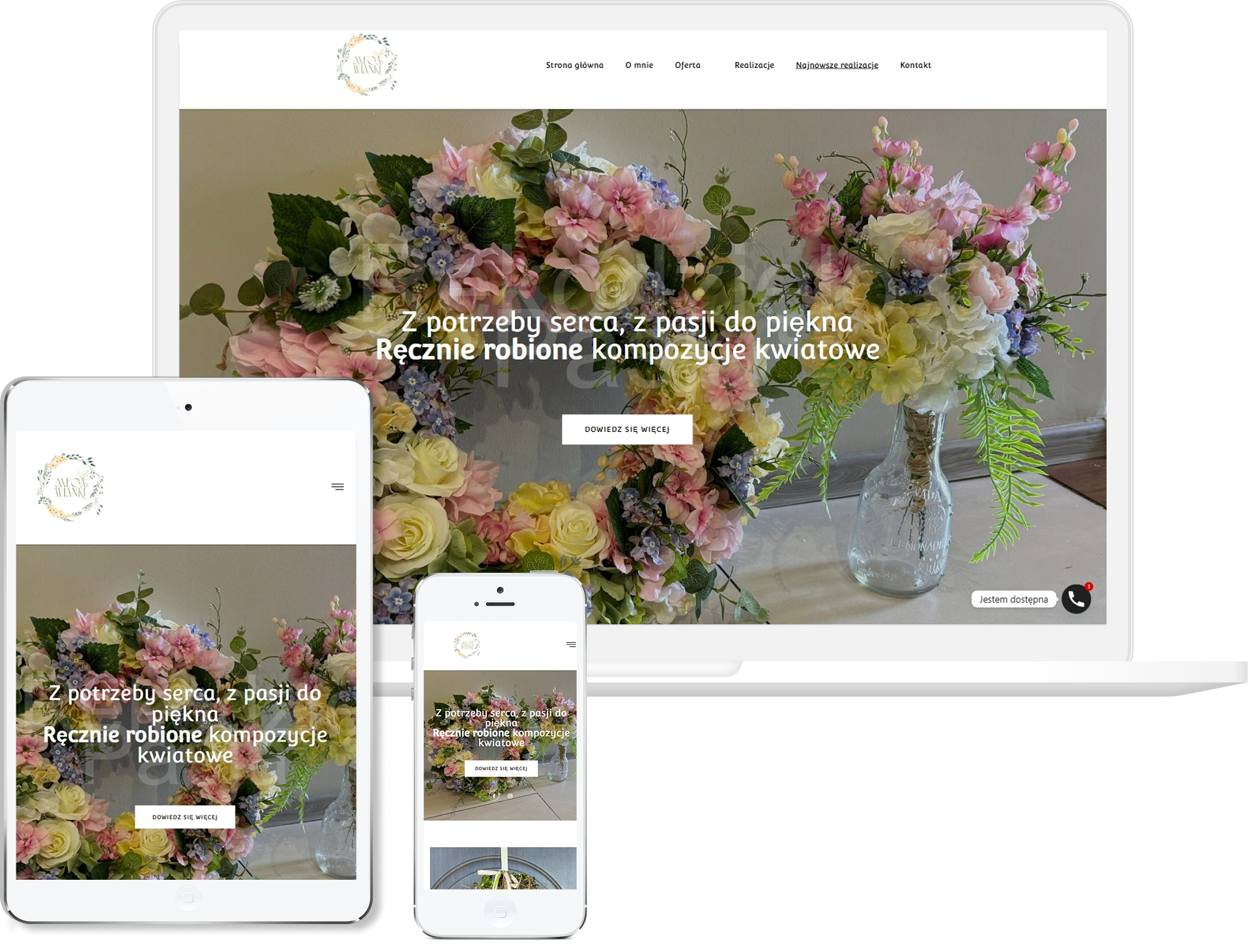 Strona Megan Wianki od pierwszego kliknięcia oddaje ducha rękodzieła — zachęca hasłem „Z potrzeby serca, z pasji do piękna”, co natychmiast sugeruje, że tu liczy się serce i indywidualne podejście. Oferta wianków, stroików i kompozycji nagrobnych jest przedstawiona czytelnie i estetycznie, tak że klient wie od razu, co może zamówić. Każda praca jawi się jako unikalna — autorka podkreśla, że nie produkuje masowo, tylko tworzy z emocji, co buduje poczucie wyjątkowości