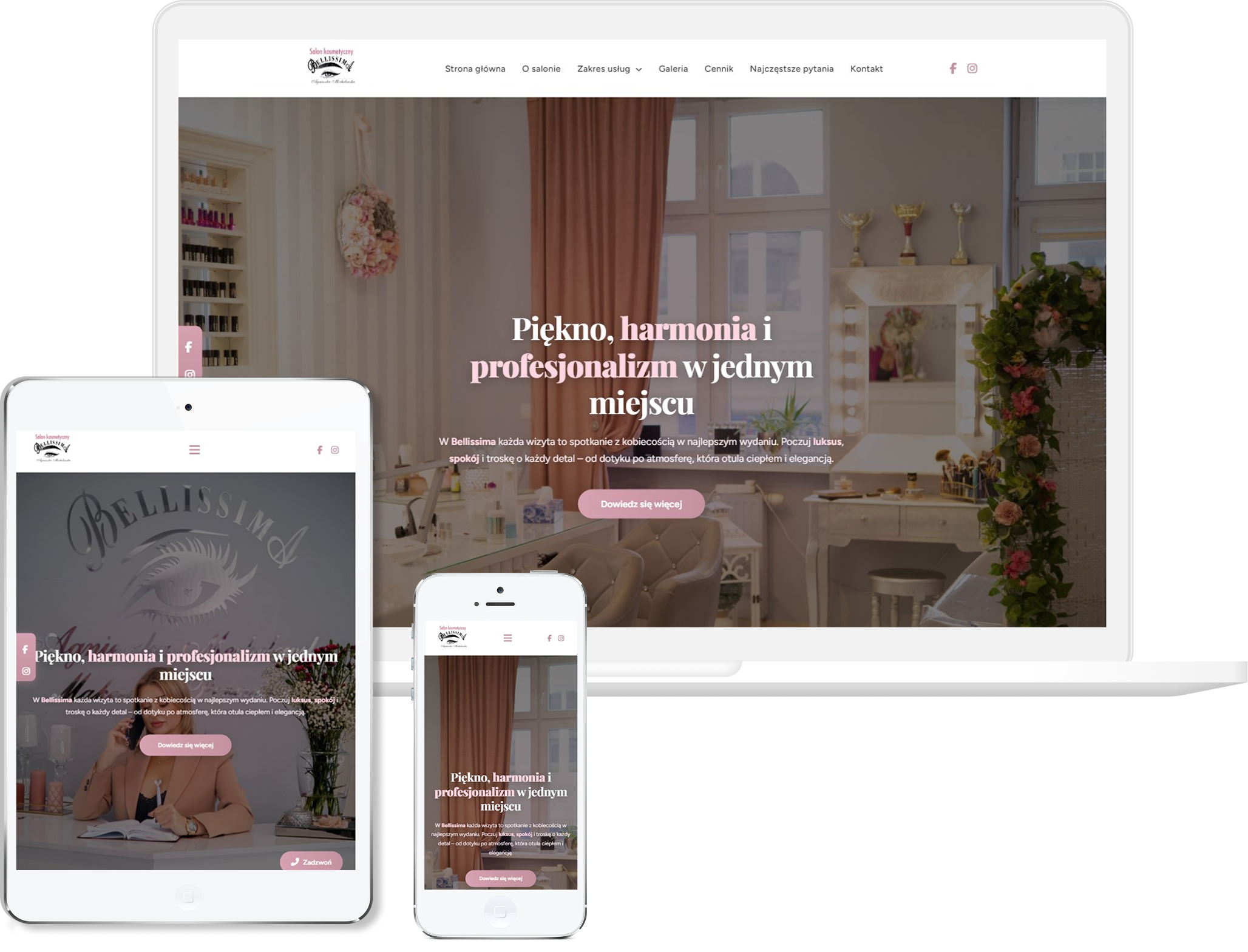 Strona Salon Bellissima zachwyca od pierwszego wejrzenia — już na wejściu ujawnia klimat elegancji, spokoju i profesjonalnej troski o klienta. Przejrzysty układ oraz logicznie zaprezentowana oferta zabiegów pozwalają natychmiast zorientować się, co salon proponuje, bez żadnego chaosu. Wyróżnia się autentycznością — historia właścicielki oraz opowieść o jej pasji do piękna dodają stronie ludzkiego oblicza.