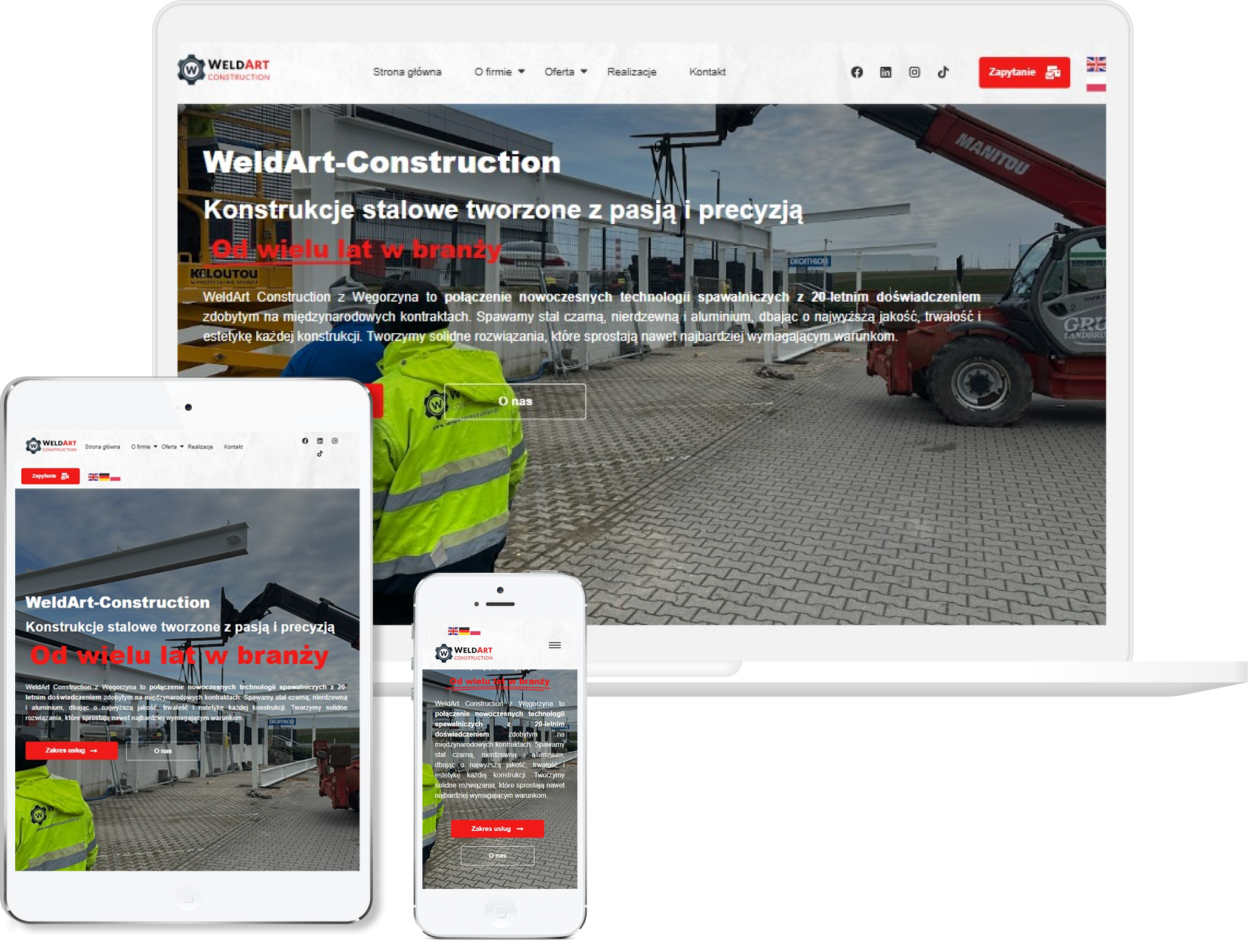 WeldArt Construction prezentuje się jako firma z prawdziwą pasją do spawania i konstrukcji stalowych, co od razu daje klientowi poczucie, że ma do czynienia z fachowcami, a nie przypadkowymi rzemieślnikami. Strona klarownie pokazuje zakres oferowanych usług — od konstrukcji stalowych i zadaszeń, przez balustrady, schody i wiaty, po cięcie laserowe czy gięcie CNC — co pozwala od razu zorientować się, czy firma spełnia konkretne potrzeby.
